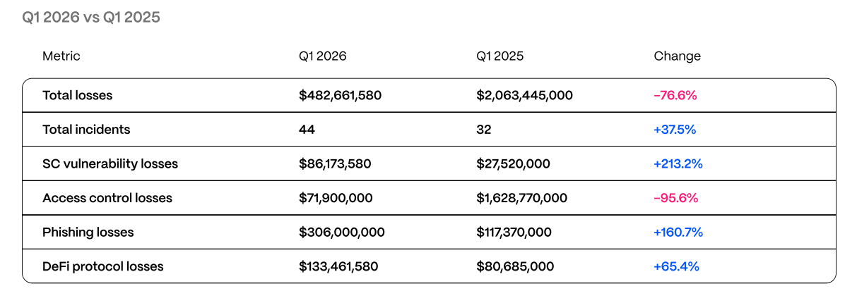 Hacken’s Q1 2026 Security & Compliance Report puts the quarter’s losses at $482.6 million. Earlier figures covered incidents only through March 22. A social engineering scam on March 31 added another $18.2 million and pushed the final quarter total 20.9% above Q4 2025.