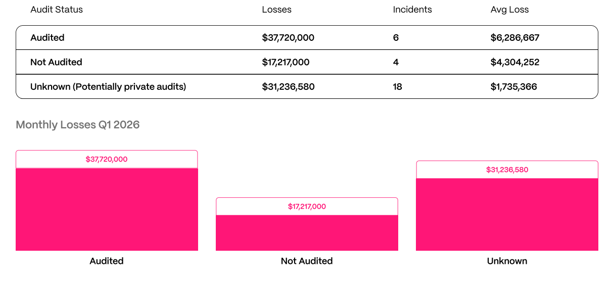 The report says six audited protocols were exploited during the quarter. One had already gone through 18 audits. Audit coverage still helps, but the Q1 figures show audit work alone does not keep a protocol safe over time.