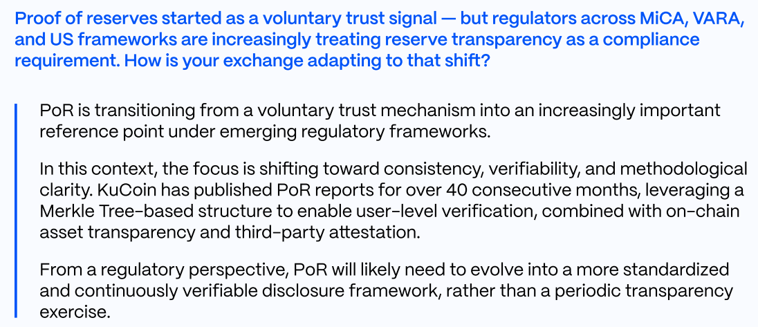 For example, in the extract below, Hacken asked KuCoin how PoR is evolving into regulatory infrastructure.