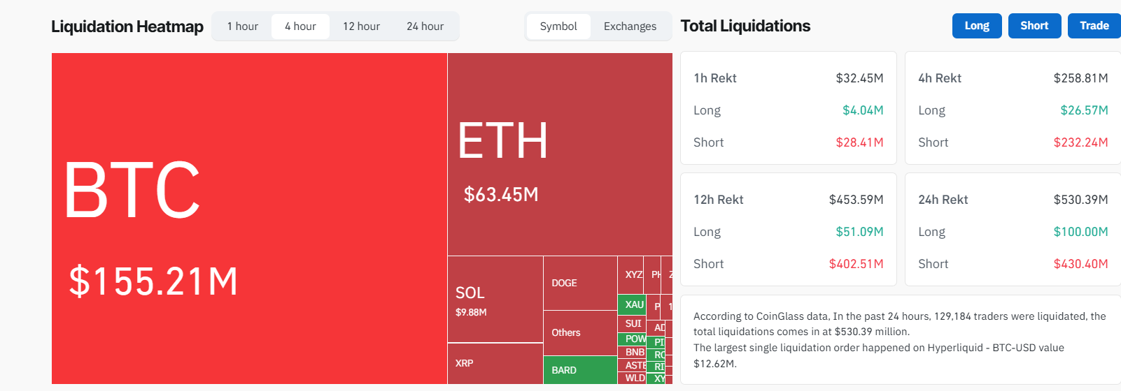 The move forced a cascade of short liquidations across derivatives markets, with Coinglass data showing nearly $30 million in short positions blown out over the past hour. This brings total liquidations to $530 million over the last 24 hours.